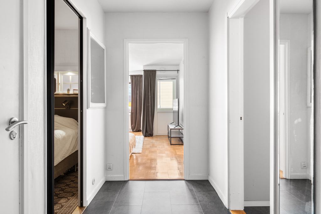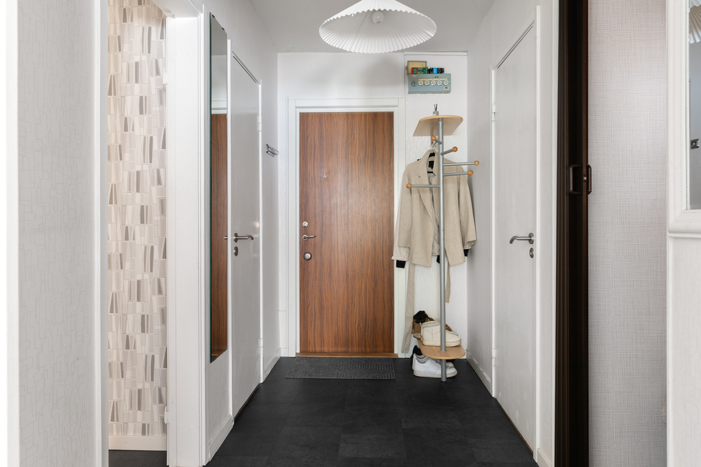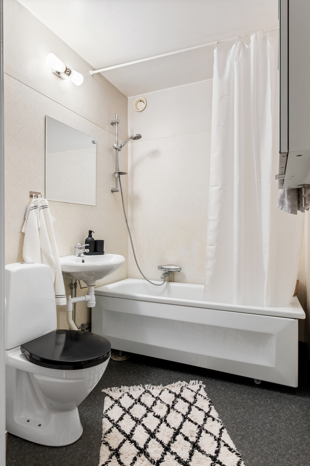 Vidare finns ett badrum med stilrent uttryck samt med badkar. I hallen hittar du en rymlig klädkammare för praktisk förvaring.