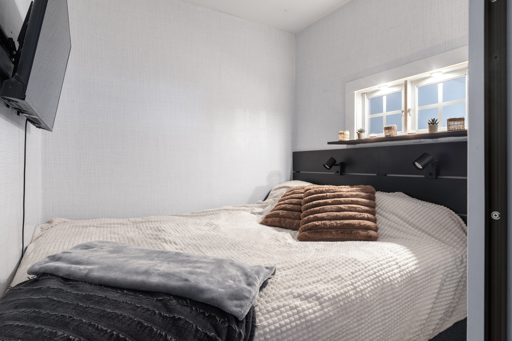 Rummet delas av väggar till en avskild sovalkov som ger en rofylld sovmiljö.